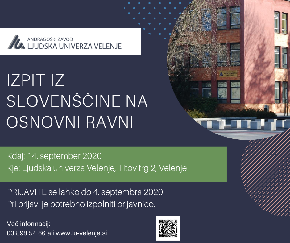 Izpitni rok iz znanja slovenščine na osnovni ravni, bo potekal 14. septembra 2020 na Ljudski univerzi Velenje.