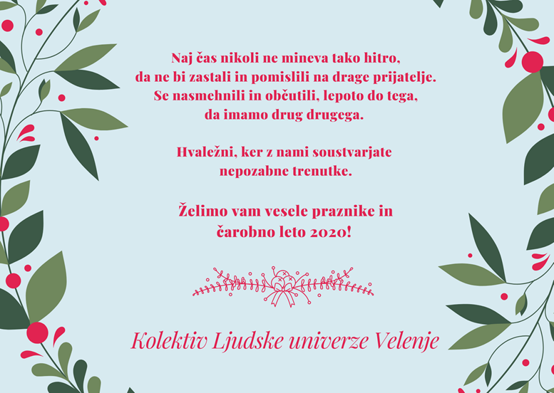 Kolektiv Ljudske univerze Velenje vsem skupaj želi vesele božične praznike in srečno ter uspešno novo leto 2020.