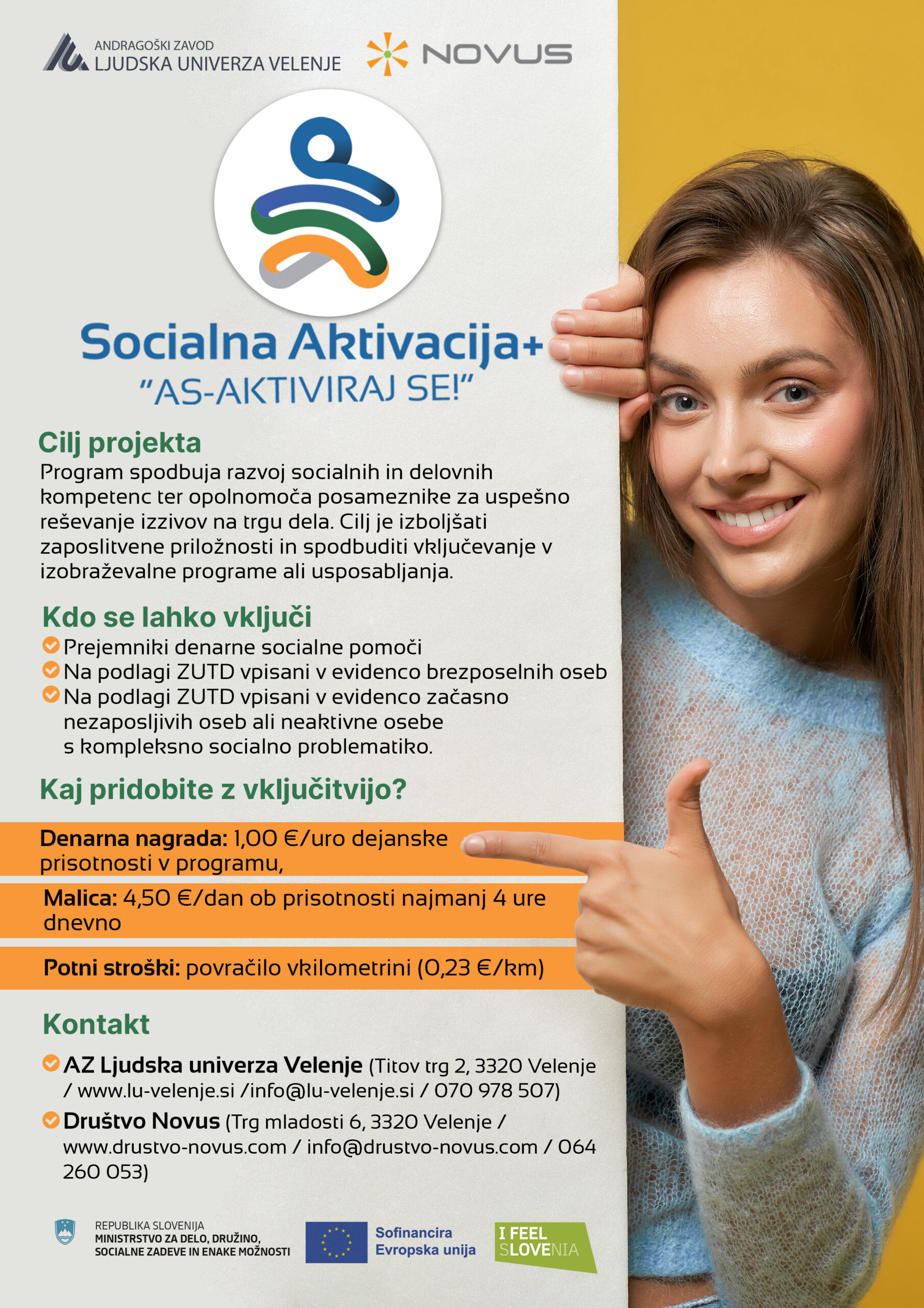 Projekt Socialna aktivacija+ »AS – Aktiviraj se!« je zasnovan kot podpora brezposelnim osebam pri pridobivanju novih znanj in veščin za lažjo vključitev na trg dela. Program, ki ga izvaja Andragoški zavod Ljudska univerza Velenje v partnerstvu z Društvom NOVUS, je prilagojen posameznikom, ki se v življenju soočajo z različnimi izzivi in ovirami pri iskanju zaposlitve.